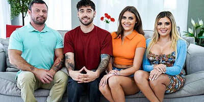 Curvy MILF and stepdaughter banging with two horny neighbors